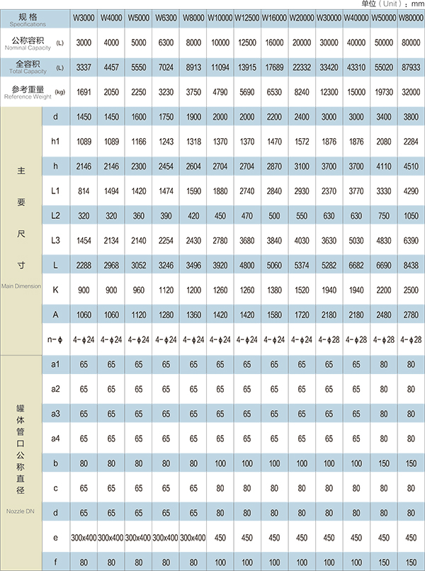 【W(wǎng)3000L-W80000L臥式搪玻璃貯罐的技術(shù)參數(shù)】: